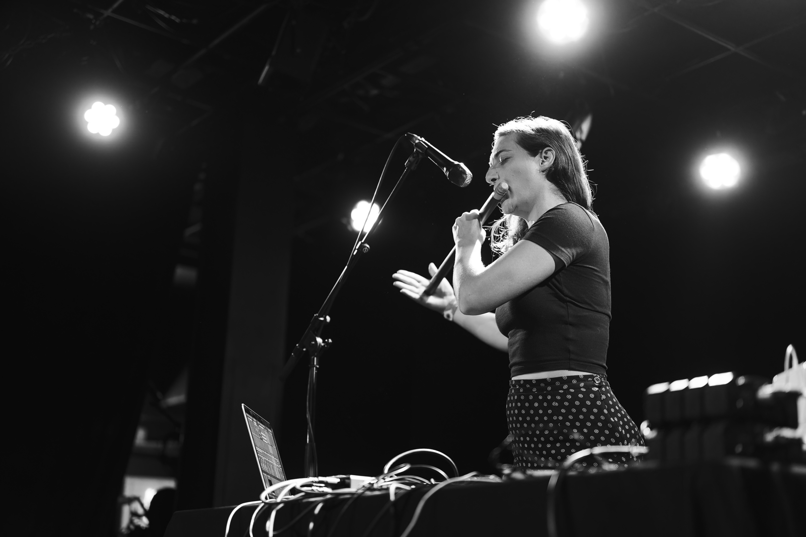 Lea Bertucci nous a fait une Shabaka Hutchings* : on l’attendait au saxophone alto ou à la clarinette basse et elle a joué de la flûte, instrument à la mode en ce moment (même les anciens rappeurs comme André 3000 du groupe Outkast s’y mettent). Seule en scène également, mais derrière une table bardée de jouets électroniques, sa production fut des plus courtes : vingt-cinq minutes inspirées nous apprit-elle à la fin du set par une éclipse solaire. Lea Bertucci est une architecte du son. Ce qui l’intéresse, c’est la texture sonore. Elle mêle samples de sa flûte jouée en direct, bruits du quotidien pré-enregistrés et sons dissonants. Elle triture et malaxe littéralement son arsenal d’enregistrements en jouant de leur assemblage et de l’intensité du résultat global. Elle obtient ce qui pourrait s’apparenter au bruit blanc – white heat – du nom même du festival. La proposition est cependant tellement courte qu’il est difficile de s’installer dans cet univers bruitiste et discordant, qui ne fut qu’ébauché et relativement dénué de surprises. La vue de vidéos sur Youtube laissait présager un résultat plus aventureux. La demoiselle s’est sans nul doute montrée un peu trop avare de son talent. D’ordinaire, le vin naturel s’accompagne de générosité…